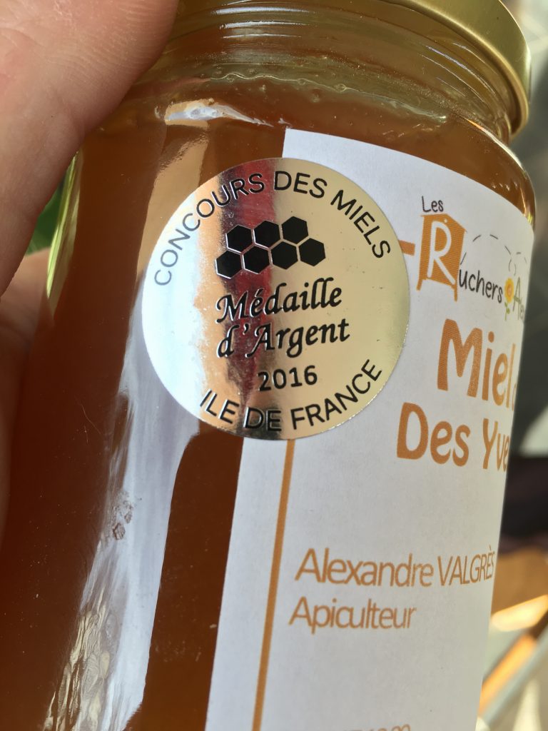 Nous avons obtenu notre première récolte au mois de juillet 2016 (châtaignier). Nous étions tellement heureux, surpris par la quantité (avoir du miel n’était pas notre but premier) et « fiers » lorsque tous nos amis/collègues/famille nous ont submergé de compliments au sujet du miel de nos petites protégées! Notre apiculteur « référent » nous a même conseillé de nous inscrire au concours des miels d’Île de France…. et nous voici Médaille d’Argent du miel de châtaignier 2016 !!!… Ex aequo avec un autre apiculteur…. 🙂