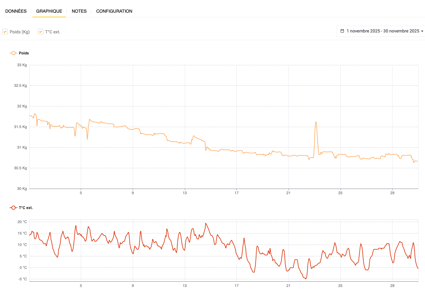 J’estime la fin du couvain, par la courbe devant plate vers 20 octobre, résultant de besoins énergétiques plus bas liés à la fin des larves à élever.