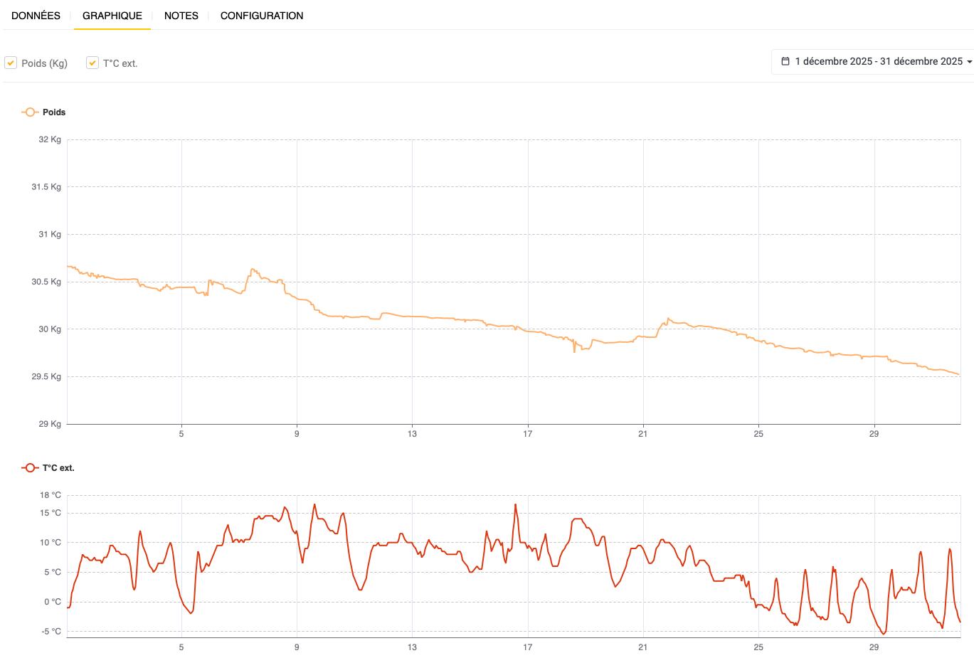 Il y a un facteur que je comprends à l’heure où j’écris (20/02/2025) et qui fausse le poids des ruches.