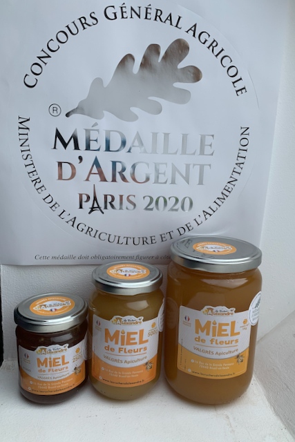 Notre miel de fleurs a été récompensé par une médaille d'argent au Concours Général Agricole de Paris en 2020, attestant de sa qualité exceptionnelle.
